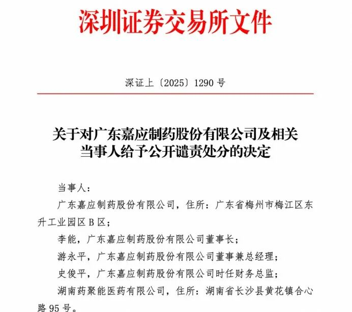 深交所称,根据广东证监局《行政处罚决定书》(〔2025〕19号)及本所查明的事实,嘉应制药及相关当事人存在关联方非经营性资金往来、违规提供财务资助等违规行为。