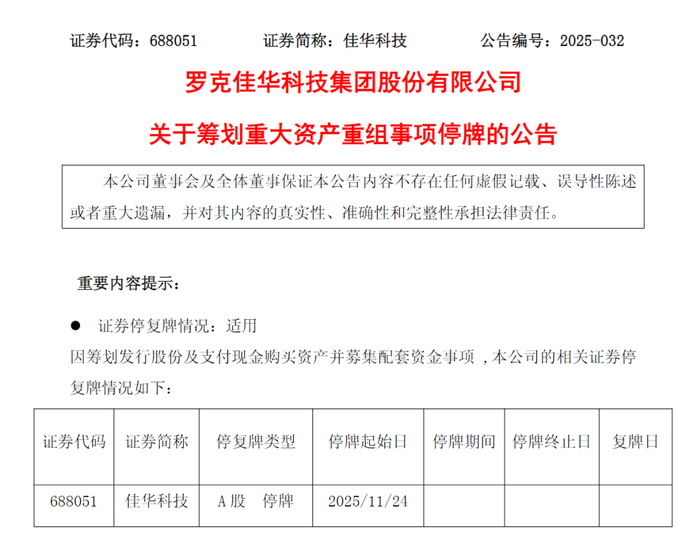 11月23日晚,佳华科技(688051)公告称,公司正在筹划以发行股份及支付现金的方式购买数盾信息科技股份有限公司(简称“数盾科技”)的控股权并募集配套资金,可能构成重大资产重组。公司股票自2025年11月24日起停牌,预计停牌时间不超过5个交易日。