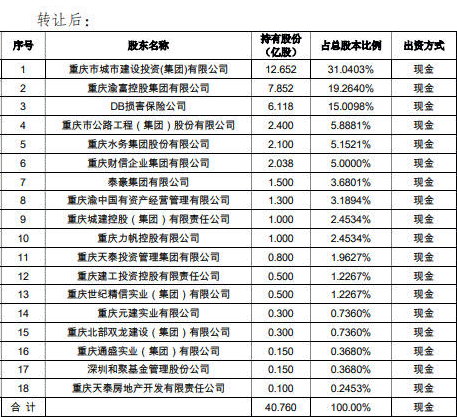 股权转让后,重庆渝富控股集团有限公司所持安诚财险达到7.652亿股(股权占比18.7733%),安诚财险股东减至18家。