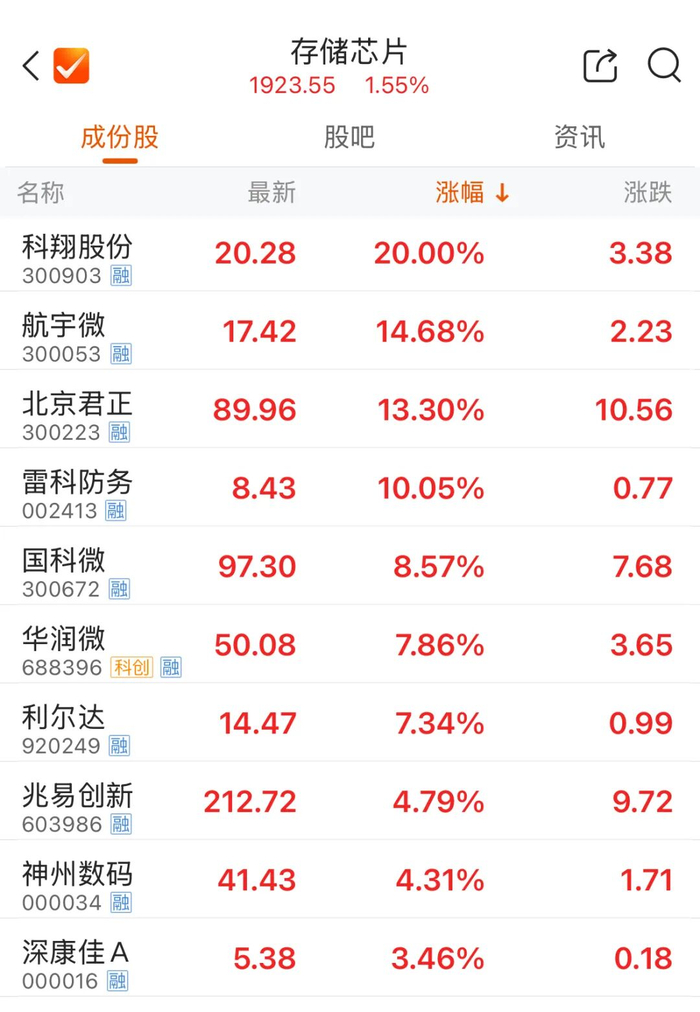 存储芯片概念拉升,科翔股份“20cm”涨停,雷科防务涨停,航宇微、北京君正涨超10%。