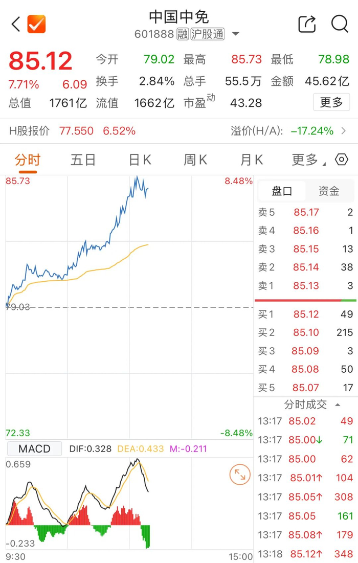 此外,免税店板块震荡上扬,中国中免一度涨超8%,截至发稿涨7.71%,凯撒旅业、王府井、广百股份等跟涨。