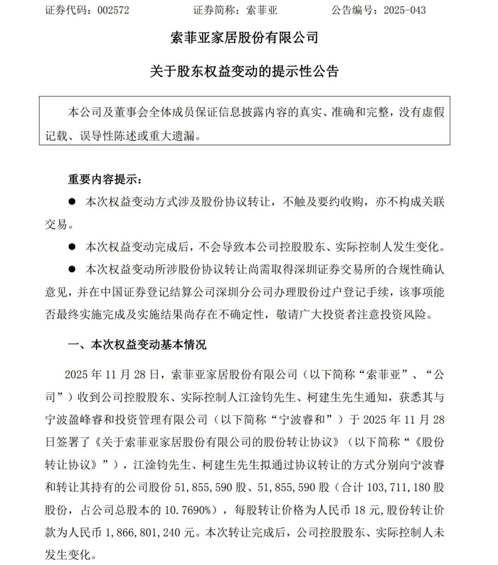 近日,索菲亚发布公告称,公司控股股东、实际控制人江淦钧、柯建生拟通过协议转让的方式向宁波盈峰睿和投资管理有限公司(下称“宁波睿和”)转让其所持公司股份合计1.04亿股,占公司总股本的10.77%,转让价格为18元/股,总价达18.67亿元。
