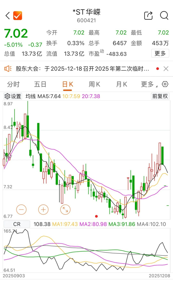 12月8日,*ST华嵘(600421)开盘后跌停,报7.02元/股。此前两个交易日,*ST华嵘已连收两个跌停板。