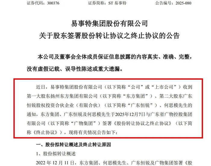 ST易事特同时公告,12月7日,东方集团、何思模与广东恒锐、广东省广物控股集团有限公司(简称“广物集团”)签署《股份转让协议之终止协议》,各方同意解除原《股份转让协议》。