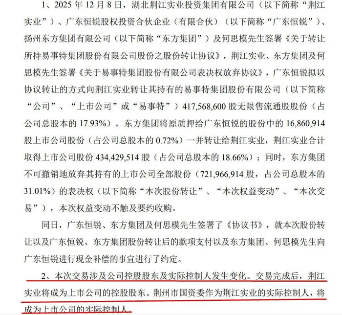 12月8日晚间,ST易事特公告,广东恒锐股权投资合伙企业(有限合伙)(简称“广东恒锐”)拟将其持有公司的4.18亿股通过协议转让的方式转让给湖北荆江实业投资集团有限公司(简称“荆江实业”),同时扬州东方集团有限公司(简称“东方集团”)拟将其质押给广东恒锐股份中的1686.09万股公司股份一并转让给荆江实业。本次股份转让价格为5.61元/股,总计24.37亿元,荆江实业以现金方式向广东恒锐支付股份转让价款。此外,东方集团还将不可撤销地放弃其持有的公司全部股份31.01%的表决权。