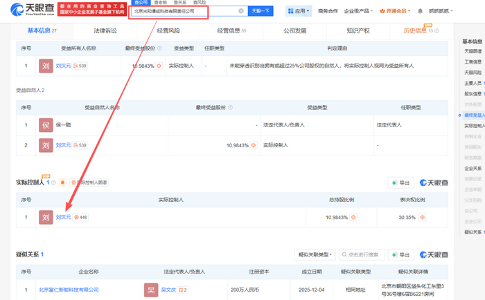 天眼查显示,北京光和谦成科技有限责任公司实控人为刘汉元,持股比例为10.9843%,表决权比例为30.35%。刘汉元为通威集团实控人,现任通威集团董事局主席。