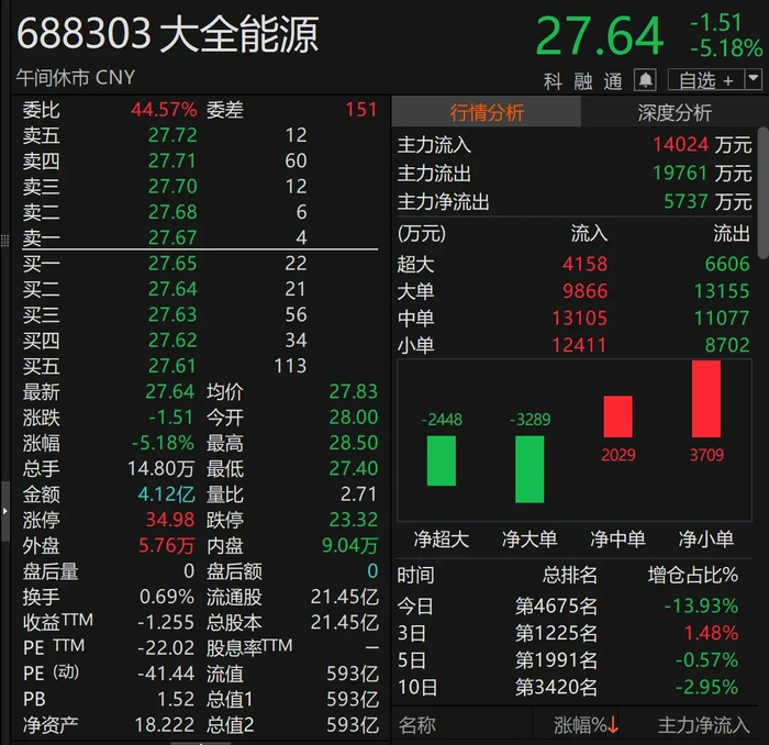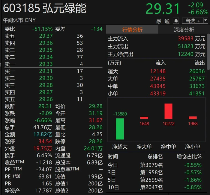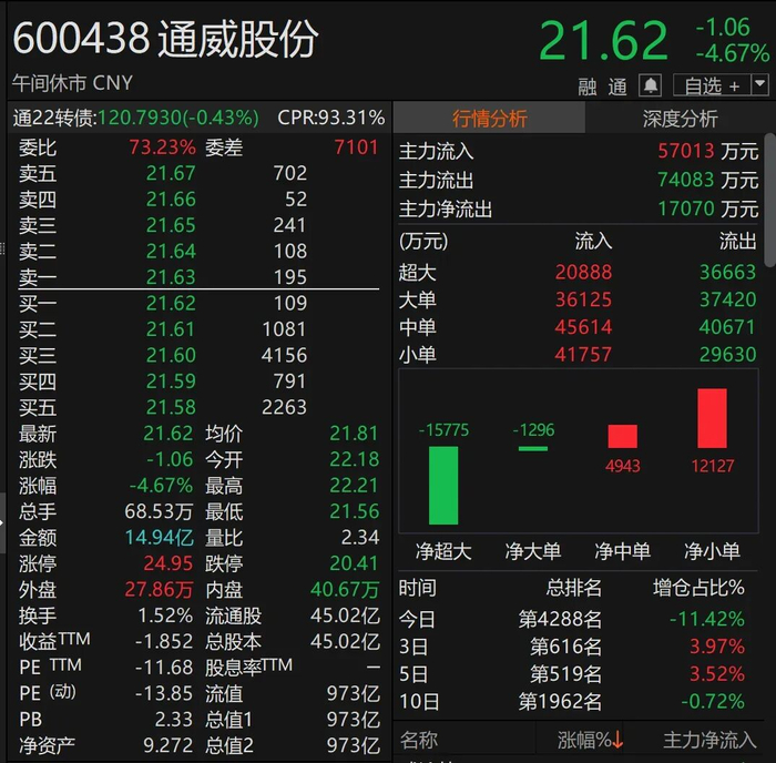 12月10日上午,硅料概念股并未因光和谦成成立的消息上涨,整体表现低迷。截至午间收盘,通威股份跌4.67%,协鑫科技跌3.39%,大全能源跌5.18%,弘元绿能跌6.66%。