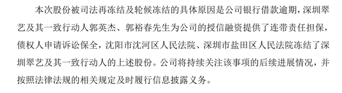 借款逾期的影响还蔓延至公司多位股东层面。2月6日晚间,萃华珠宝发布公告称,公司股东深圳翠艺、郭英杰、郭裕春所持股份遭司法冻结,累计冻结股份分别占公司总股本的5.56%、4.86%和1.79%。据同日公告,汉阳法院向广发营业部送达协助执行通知书,要求变现郭英杰所持公司股票中的256万股。