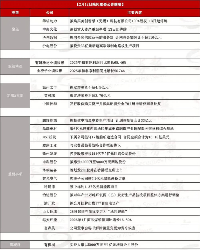 中南文化:公司正在筹划通过发行股份及支付现金的方式购买江阴苏龙热电有限公司控股权并募集配套资金。本次交易预计构成重大资产重组,构成关联交易,不构成重组上市。公司股票自2026年2月13日开市起停牌。