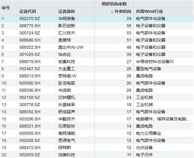 从调研个股来看,今年以来截至2月25日,华明装备获得59家外资机构调研,在所有个股中排名首位;影石创新、汇川技术、奥普特也均获得50家以上外资机构调研。此外,怡合达、安集科技、大金重工、思特威、卧龙电驱、华润微等个股获得20家以上外资机构调研。