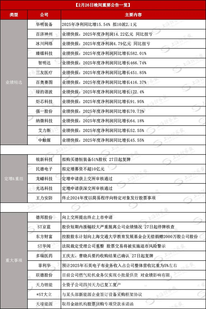 (备注:数据截至2月26日21:00,后续公告内容请下载上证报APP在快讯栏目查看;或在微信首页菜单“上证财讯”中查看。)