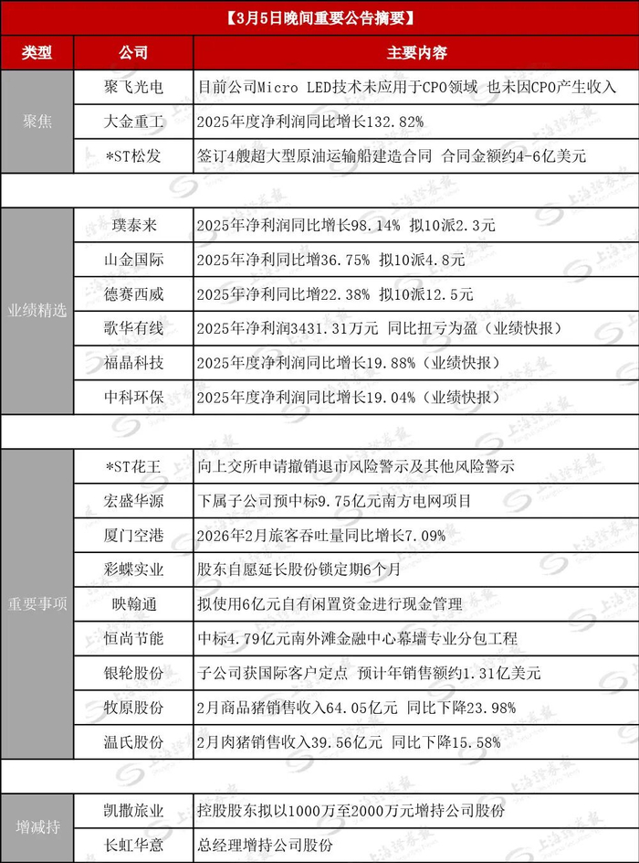 (备注:数据截至5日21:30,后续公告内容请下载上证报APP在快讯栏目查看;或在微信首页菜单“上证财讯”中查看。)
