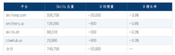 更值得关注的是,作为智能体能力核心的“Skills”(技能模块)生态,正经历着爆发式增长。全球四大主流平台的Skills总量已逼近75万个,且每天以2%—3%的增速新增约2.1万个。按照这一趋势,一年后Skills总量将突破800万。