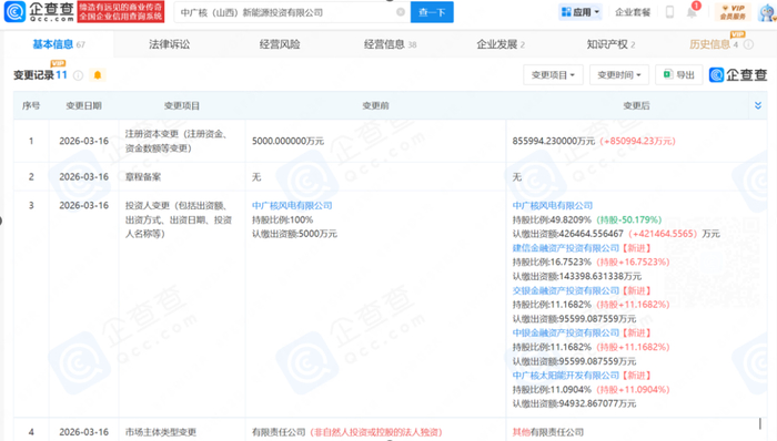 企查查显示,变更后该企业注册资本由5000万元增至85.6亿元,增幅达17020%。其中,中广核风电有限公司增资42.65亿元,出资比例49.82%;同属中广核旗下的中广核太阳能开发有限公司出资9.49亿元,出资比例11.09%。