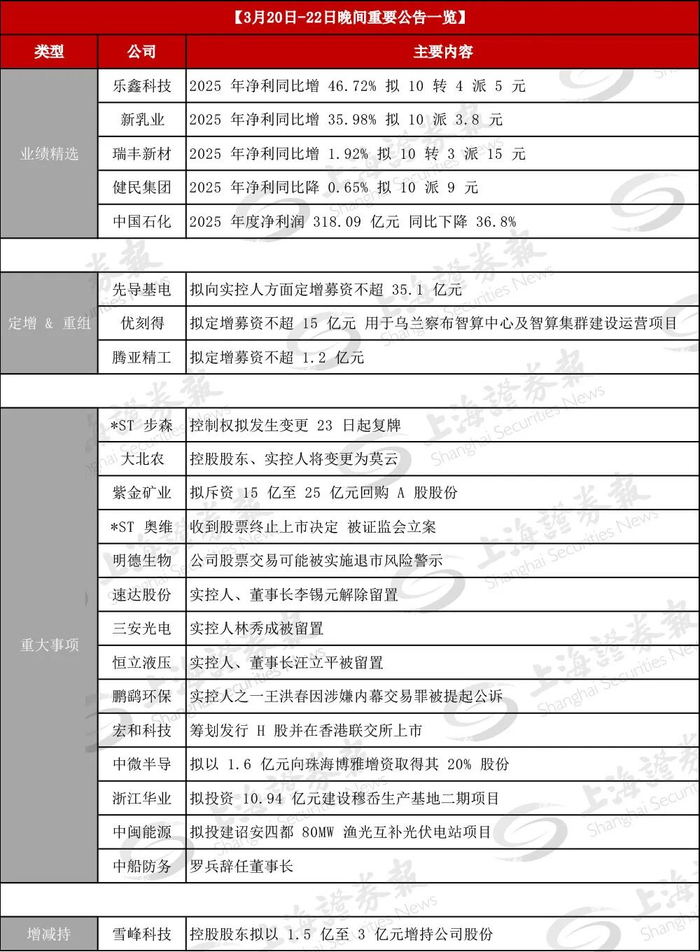 (备注:数据截至3月22日19:00,后续公告内容请下载上证报APP在快讯栏目查看;或在微信首页菜单“上证财讯”中查看。)
