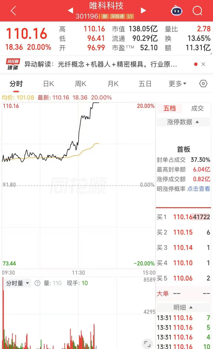 3月25日午后,机器人概念走强,多股涨停。唯科科技(301196)“20cm”涨停,海川智能、震裕科技等涨超10%,天玑科技、阿莱德、维科技术等午前封板。