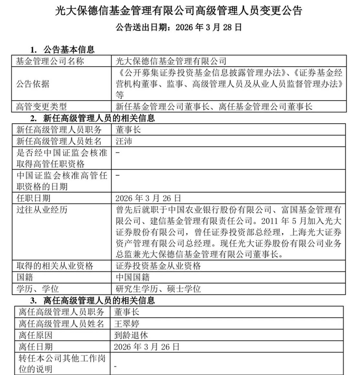 3月28日,光大保德信基金发布公告称,自3月26日起,公司原董事长王翠婷因退休卸任,汪沛同日接任为该公司董事长。