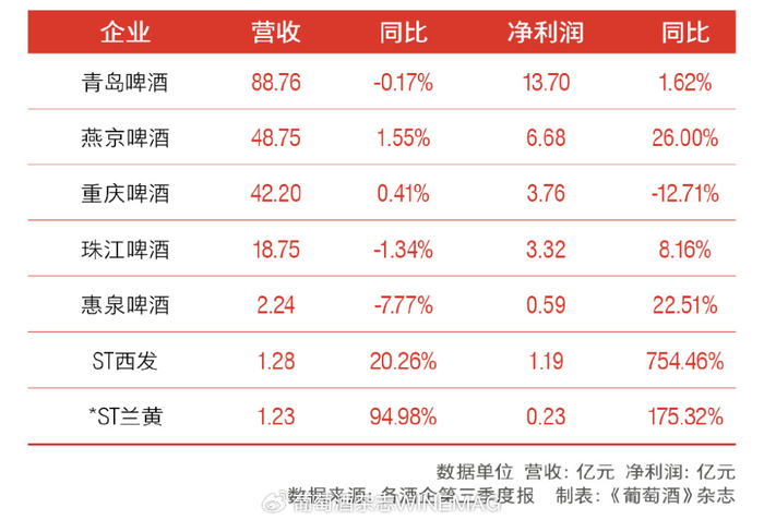三季度为啤酒传统消费旺季,啤酒板块整体表现优于葡萄酒与白酒。7家上市啤酒企业中,仅重庆啤酒净利润下降,其余企业多呈增长态势。