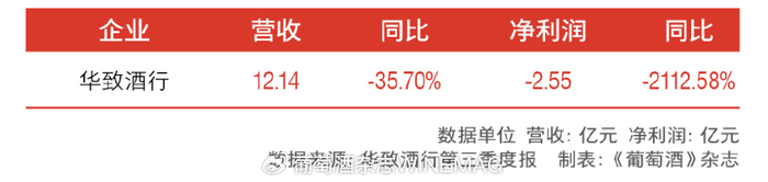 作为国内唯一一家酒类流通上市公司,华致酒行的三季度报同样引发业内关注。今年第三季度,该公司实现营收12.14亿元,同比下降35.70%;净利润亏损2.55亿元,同比降幅达2112.58%。