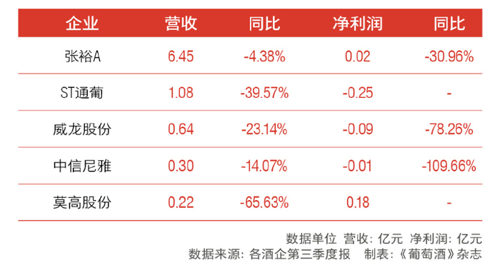 5家上市葡萄酒企业第三季度营收均呈下降态势,其中张裕以6.45亿元营收稳居行业龙头。净利润方面,张裕、威龙股份、中信尼雅均出现下滑,中信尼雅降幅尤为显著,三季度净利润同比下降109.66%。