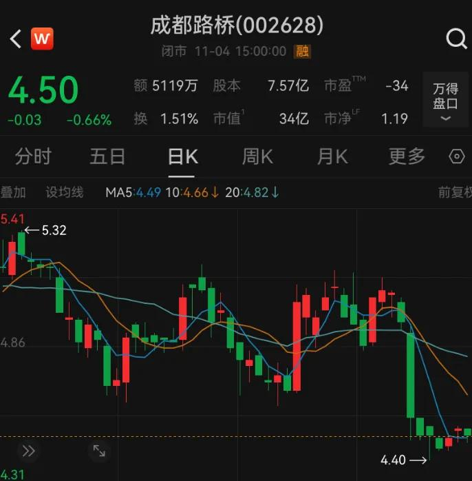截至11月4日收盘,成都路桥报4.50元/股,跌0.66%,总市值为34.07亿元。