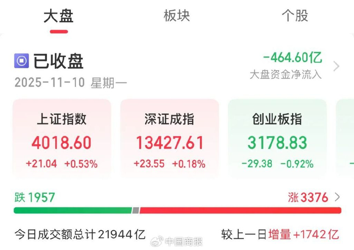 中国商报(记者 王彤旭)11月10日,A股三大指数涨跌不一。截至收盘,上证指数涨0.53%,深证成指涨0.18%,创业板指跌0.92%,北证50跌0.67%。沪深京三市全天成交额为21944亿元,较上一日放量1742亿元。全市场超3300只个股上涨。在板块题材上,白酒、旅游及酒店、美容护理、零售等大消费板块涨幅居前。
