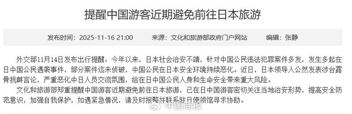 在消息面上,11月16日,中国文化和旅游部郑重提醒中国游客近期避免前往日本旅游,已在日中国游客密切关注当地治安形势,提高安全防范意识,加强自我保护,如遇紧急情况,请及时报警并联系驻日使领馆寻求协助。同日,教育部发布留学预警。