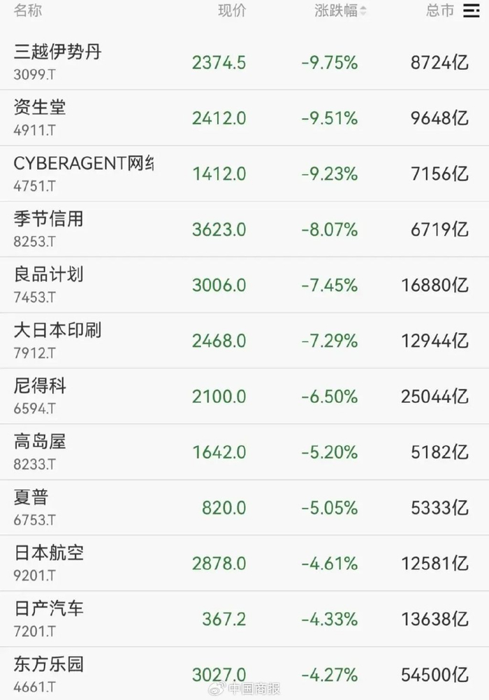 日本旅游相关概念股大幅下挫,资生堂股价下跌11%,日本航空一度下跌5%。日本消费品、零售股同样走低,三丽鸥、亚瑟士、迅销等均跌超6%。日本杂货品牌良品计划股价一度下跌12%,创2024年8月以来最大跌幅。