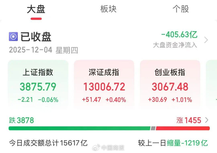 中国商报(记者 王彤旭)12月4日,A股三大指数涨跌不一。截至收盘,上证指数微跌0.06%,深证成指涨0.4%,创业板指涨1.01%,北证50跌0.37%。沪深京三市全天成交15617亿元,较上一日缩量1219亿元。全市场超3800只个股下跌。