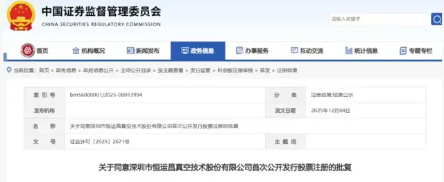 12月4日,证监会同意深圳市恒运昌真空技术股份有限公司科创板首次公开发行股票的注册申请,该批复自同意注册之日起12个月内有效。恒运昌IPO进程推进高效,6月13日申请获受理,7月6日进入问询阶段,11月14日顺利过会且当日提交注册,不足六个月完成上市核心流程。