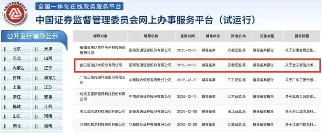 12月10日,证监会官网披露全芯智造技术有限公司已在安徽证监局完成首次公开发行股票并上市的辅导备案登记,这意味着该公司正式启动IPO进程,辅导机构为国泰海通。