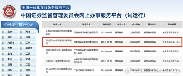 12月12日,深圳三地一芯电子股份有限公司完成IPO辅导备案,此次IPO辅导机构为国泰海通证券股份有限公司,同时配备北京市金杜(深圳)律师事务所担任法律顾问、容诚会计师事务所(特殊普通合伙)担任审计机构。