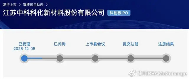 12月5日,江苏中科科化新材料股份有限公司的科创板IPO申请获上交所受理,保荐机构为招商证券。