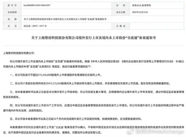 12月15日,中国证监会官网披露关于上海GPU芯片龙头壁仞科技境外发行上市及境内未上市股份“全流通”备案通知书。壁仞科技拟发行不超过372,458,000股境外上市普通股,并在香港联合交易所上市,若成功上市将成为“港股GPU第一股”。