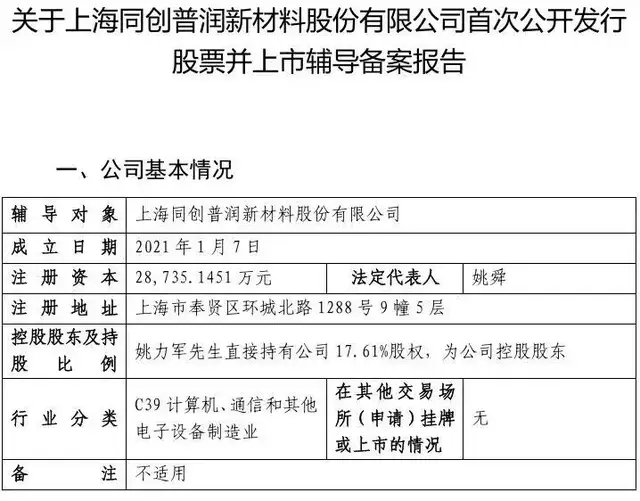 12月11日,证监会官网披露,上海半导体超高纯金属材料供应商同创普润在上海证监局办理上市辅导备案登记,启动IPO进程,辅导机构为国泰海通。