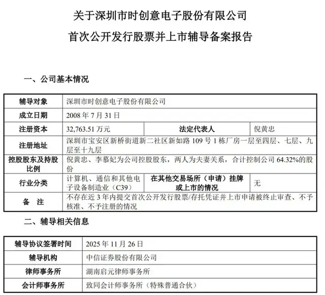 12月2日,深圳市时创意电子股份有限公司(简称:时创意)完成IPO辅导备案,辅导机构为中信证券股份有限公司。