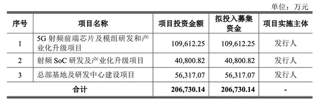 此次IPO预计募集资金总额20.67亿元,将全部投入三大核心项目,分别是5G射频前端芯片及模组研发和产业化升级项目(投资10.96亿元)、射频SoC研发及产业化升级项目(投资4.08亿元)、总部基地及研发中心建设项目(投资5.63亿元),聚焦于强化核心技术研发与产业化能力。