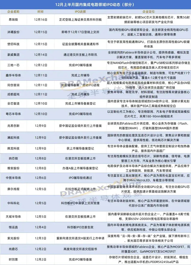 进入岁末,集成电路领域迎来了资本与产业共振的“IPO狂飙期”。据全球半导体观察不完全统计,短短半个月内,超20家企业密集推进上市进程,覆盖IC设计、半导体设备、半导体材料等产业链环节。