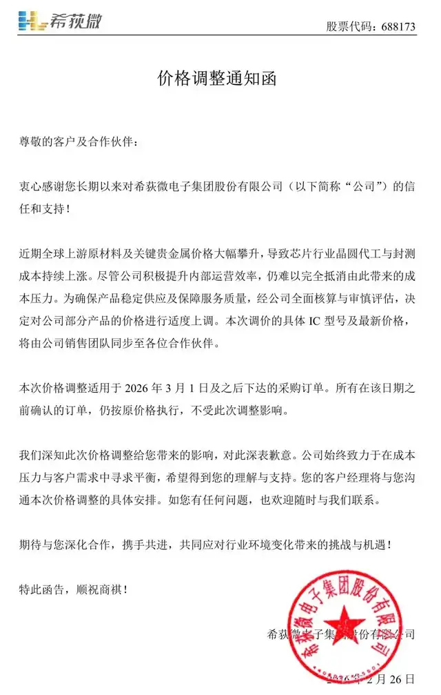 希荻微表示,本次价格调整适用于2026年3月1日及之后下达的采购订单。所有在该日期之前确认的订单,仍按原价格执行,不受此次调整影响。