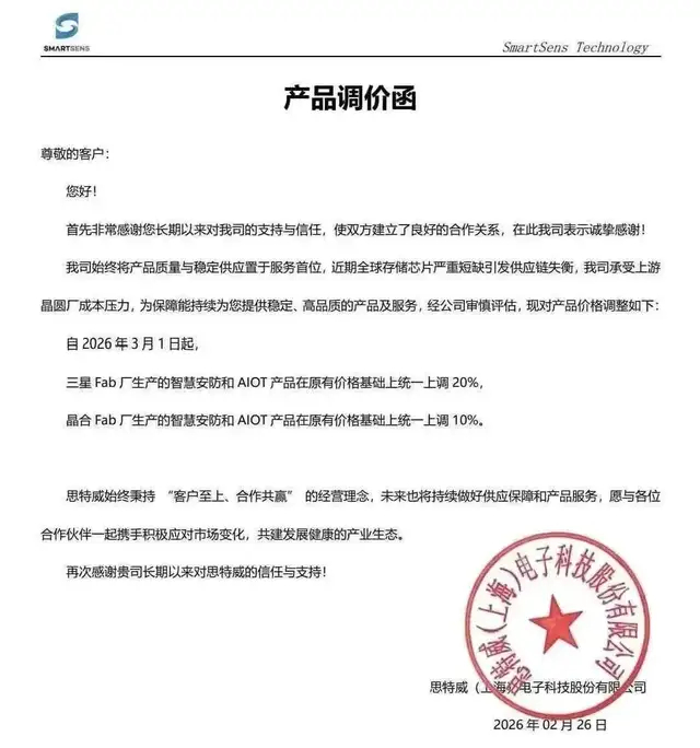 据上海证券报等媒体报道,CMOS图像传感器公司思特威也已于近日向客户发出了涨价函。