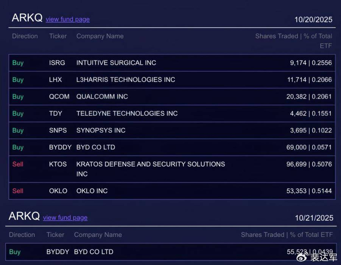 除国际投行外,以凯茜·伍德(女版巴菲特)旗下方舟投资为代表的长线资金,也在加速布局比亚迪。方舟投资在10月20日通过旗下ARKQ基金买入69000股比亚迪,10月21日再度增持55523股,这一连串的动作,充分表明了该资本对比亚迪前景的看好。