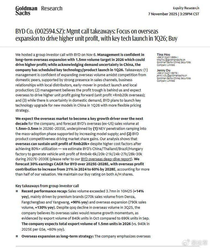 高盛在11月7日的研报中明确指出:海外市场将成为比亚迪未来十年的核心增长领域,依托完善的车型矩阵与强大的产品力,比亚迪2025年至2028年盈利年均复合增长率将达30%,海外利润贡献度将从2024年的21%升至2028年的60%,2026至2035年海外销量有望达150万至350万辆,为此高盛坚定维持其A股、H股“买入”评级,A股目标价144元人民币,相较于12月9日收盘价仍有约50%上涨空间,体现出其对于比亚迪未来市场价值的高度认同。