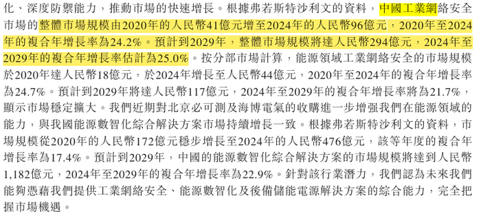 市场规模加速扩容。根据弗若斯特沙利文的数据,中国工业网络安全市场预计到2029年将达到294亿元,年复合增长率25.0%;能源数智化综合解决方案市场规模预计到2029年将达到1182亿元,年复合增长率22.9%。在这样一个双位数增长的赛道上,作为行业龙头的天地和兴理应享受到市场扩容的红利。