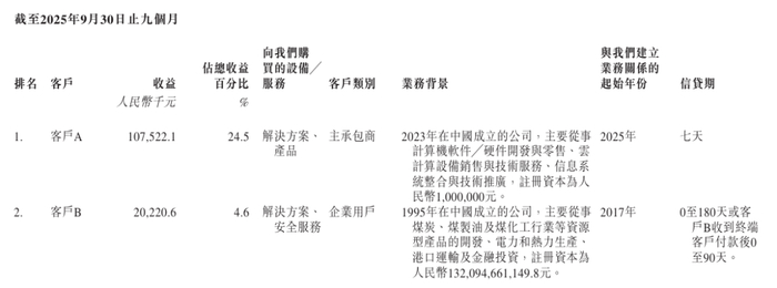 数据来源:天地和兴招股说明书深入梳理业务结构发现,天地和兴所谓“战略性承接”的低毛利项目,正是其获取新增大客户的核心方式。2024年第一大客户和2025年前三季度第一大客户,均为对应报告期内首次合作的新客户,两家客户贡献的销售收入占对应期间公司总营收的比例分别达到13.5%与24.5%。而招股书明确披露,公司对这两家核心新客户的收入,绝大部分来自硬件与软件产品的销售,该类业务的毛利率在2024年与2025年前三季度分别仅为5.2%与6.2%,几乎处于微利状态。