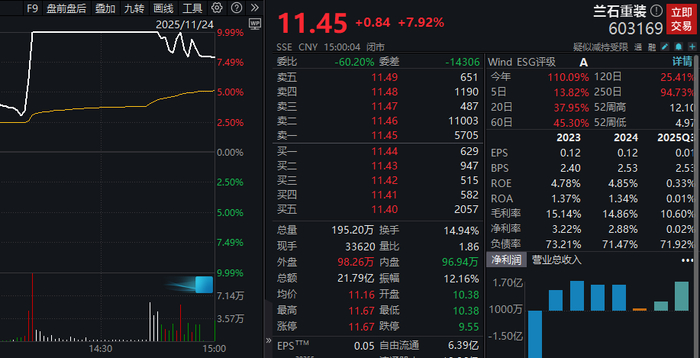 今日14时11分32秒,随着一笔超2万手的买单涌入兰石重装(603169),其股价开启了1分钟狂飙模式。但仅维持了半个多小时,距离收盘还有约15分钟之际,该股封单尽数被吞,最终收涨7.92%。