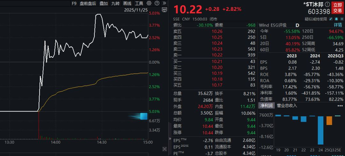 *ST沐邦近年来业绩表现不佳。今年5月,因2024年度净利润为负,且扣除与主营业务无关的业务收入和不具备商业实质的收入后的营业收入低于3亿元,*ST沐邦股票被实施退市风险警示。