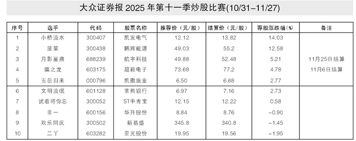 在《大众证券报》读者俱乐部第十一季炒股比赛中,选手 “小桥流水”以12.12元/股推荐的凯发电气(300407),荐股涨幅14.03%荣获冠军;选手“菠菜”以 49.03元/股 推 荐 的 鹏 辉 能 源(300438),荐股涨幅12.58%荣获亚军;选手“月影星痕”以49.88元/股推荐的航宇科技(688239),荐股涨幅5.21%荣获季军。