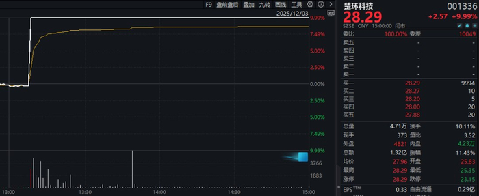 12月3日午后,楚环科技(001336)股价突然直线拉升,仅用时18秒就触及涨停。
