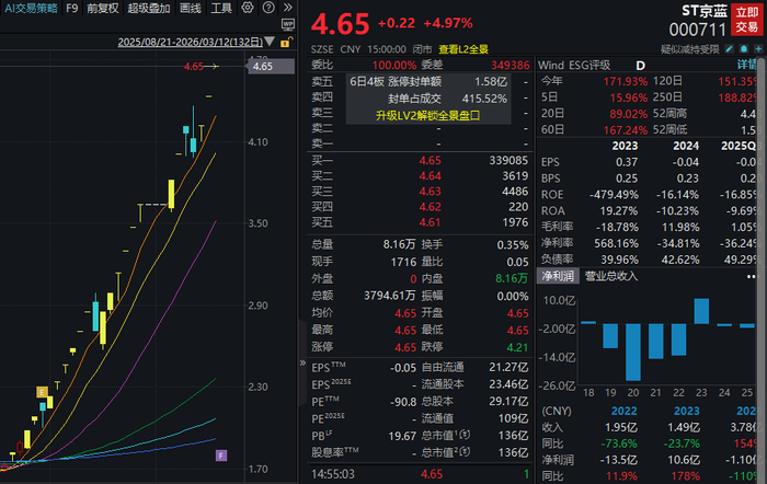 3月12日,此前频频提示股票交易风险的ST京蓝(000711)股价再度一字涨停,拿下“25天19板”。Wind数据显示,自2026年1月26日至今,该股股价累计上涨近170%。