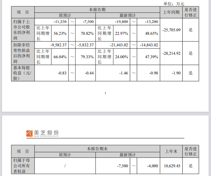 昨日盘后公告显示,美芝股份对2025年度业绩预告数据进行相应修正,修正后的归母净利润预计为-1.98亿元至-1.32亿元,预计期末净资产为负值。